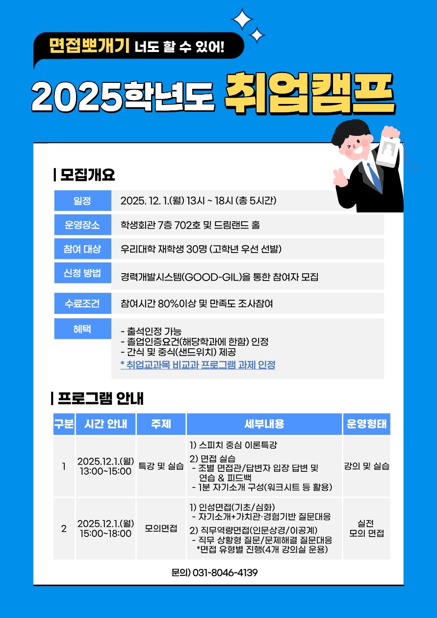 학기말을 맞아 취업을 본격적으로 준비하는 재학생들을 위해서 "취업캠프"를 준비하였습니다.