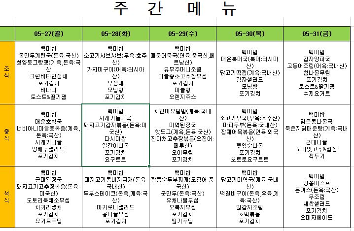 2024. 5. 27. ~ 2024. 5. 31. 주간식단표