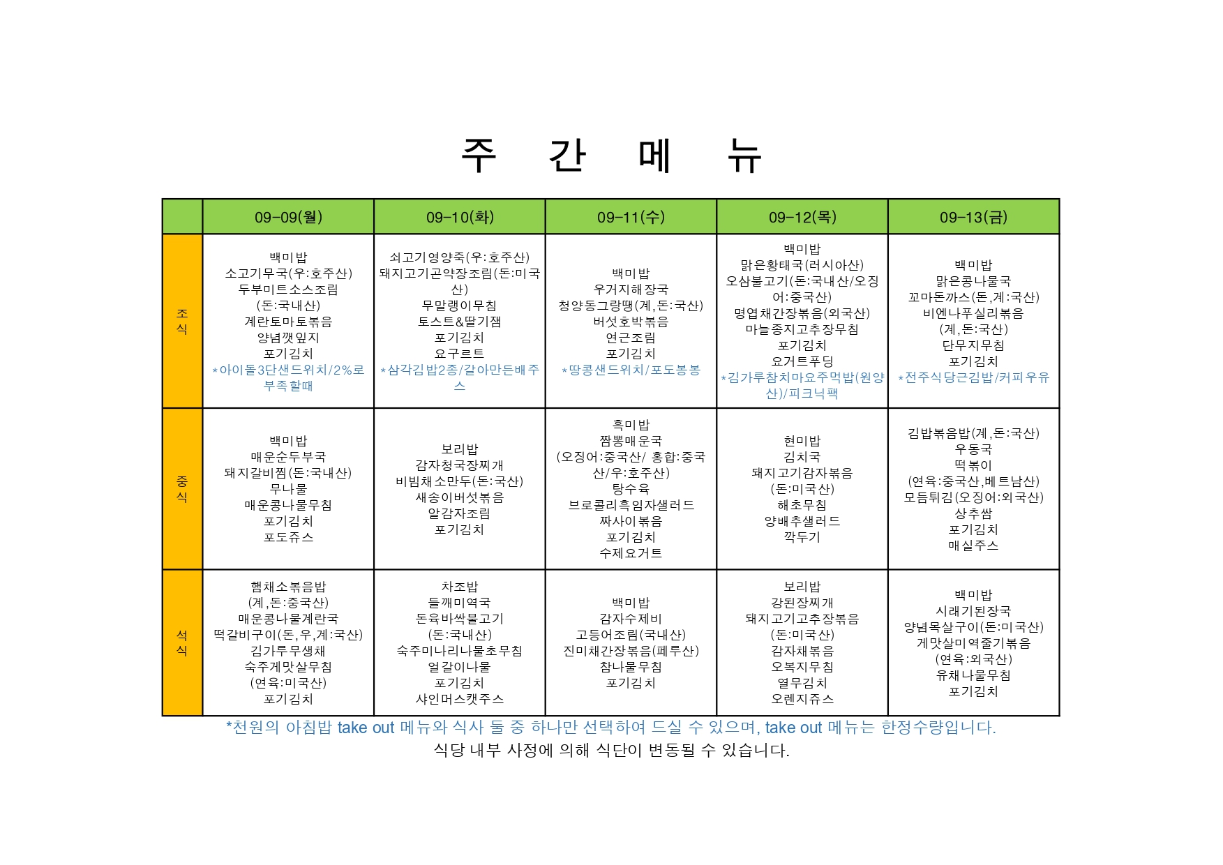 2026. 3. 9. ~ 2026. 3. 13. 주간식단표