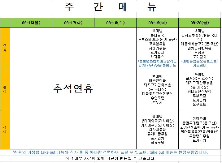 2025. 10. 13. ~ 2025. 10. 17. 주간식단표