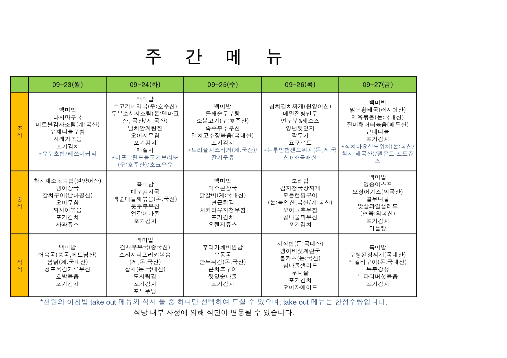 2024. 3. 25. ~ 2024. 3. 29. 주간식단표