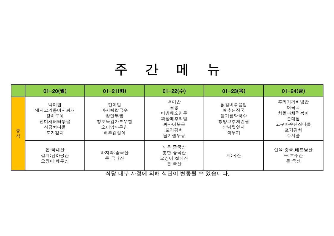 2026. 1. 19. ~ 2026. 1. 23. 주간식단표