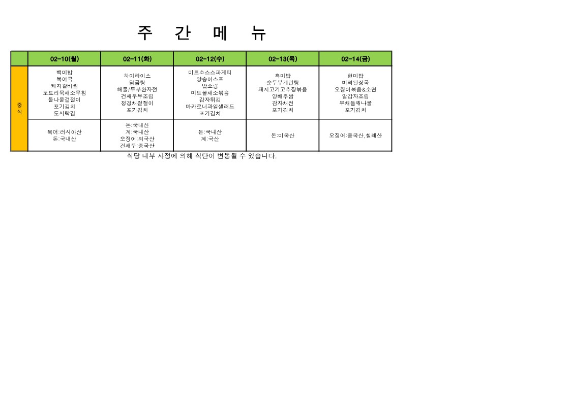 2026. 2. 2. ~ 2026. 2. 6. 주간식단표