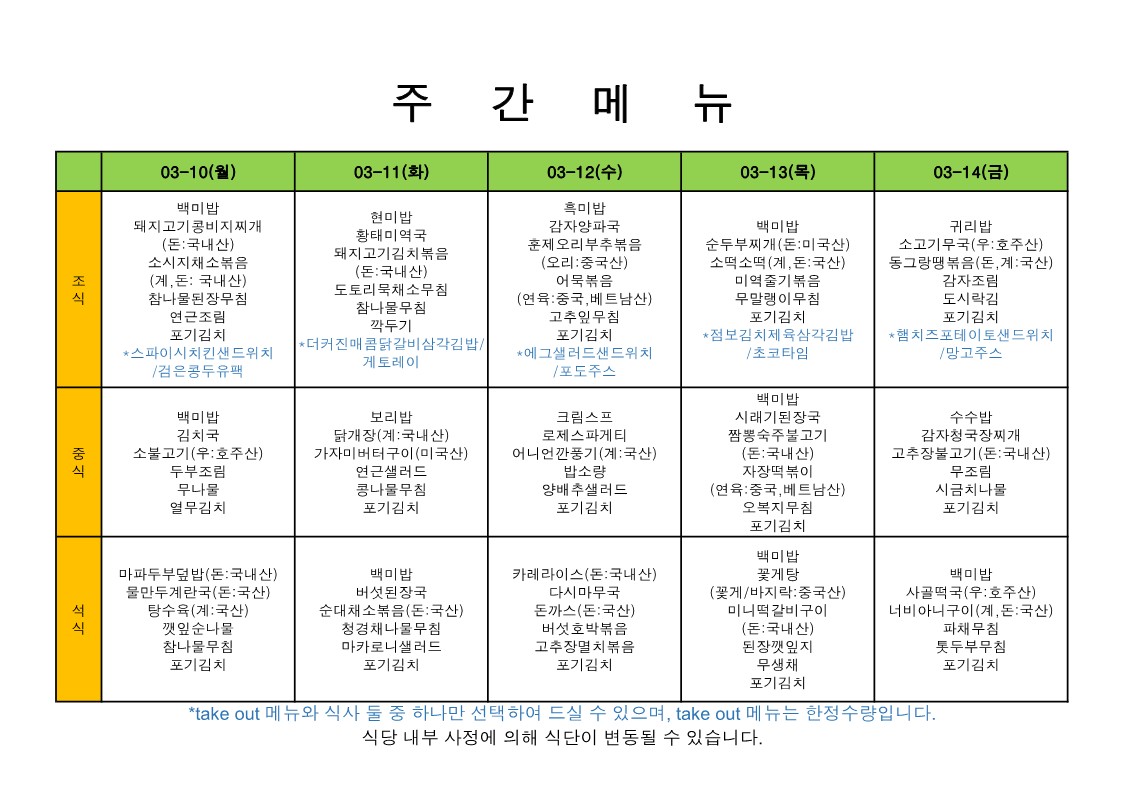 2024. 3. 11. ~ 2024. 3. 15. 주간식단표
