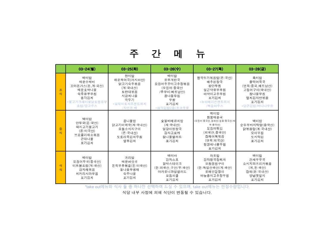 2024. 3. 25. ~ 2024. 3. 29. 주간식단표
