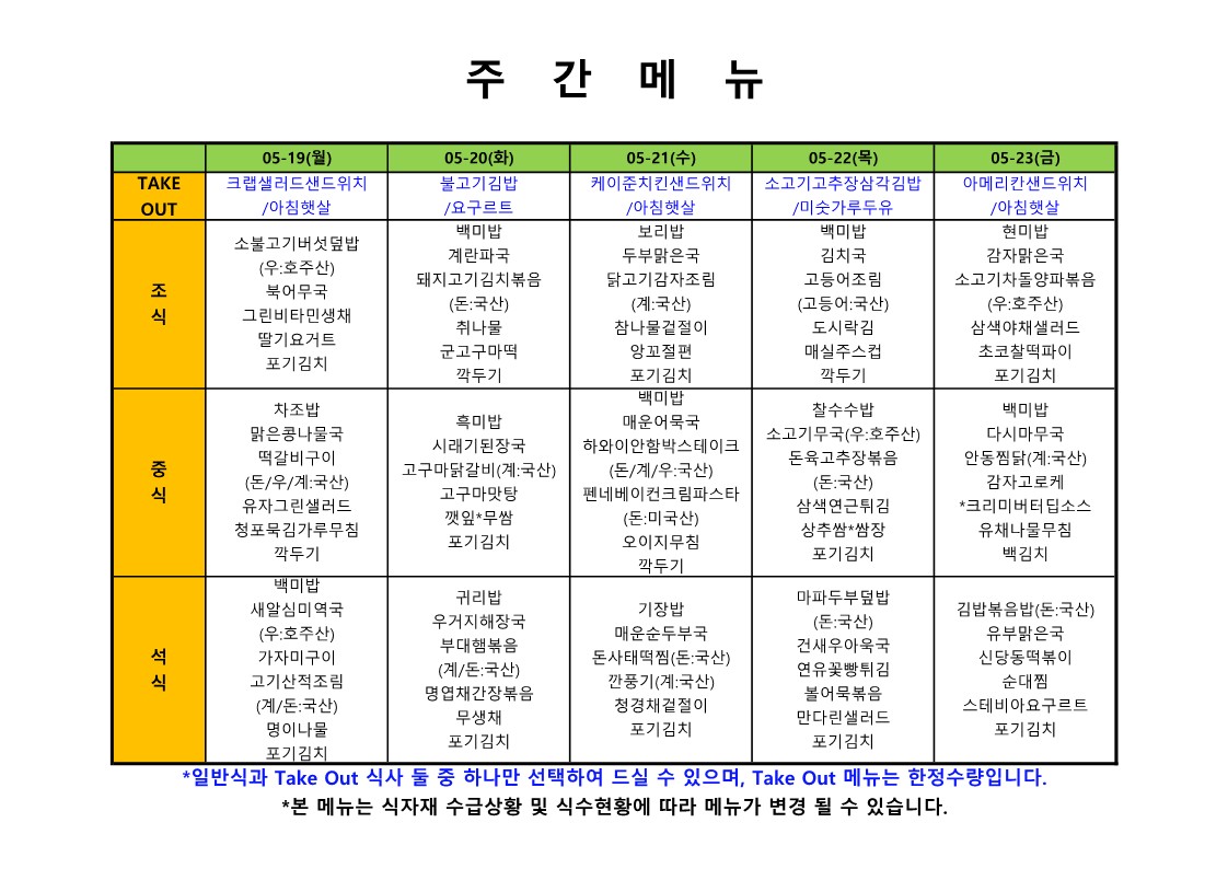 2024. 5. 20. ~ 2024. 5. 24. 주간식단표