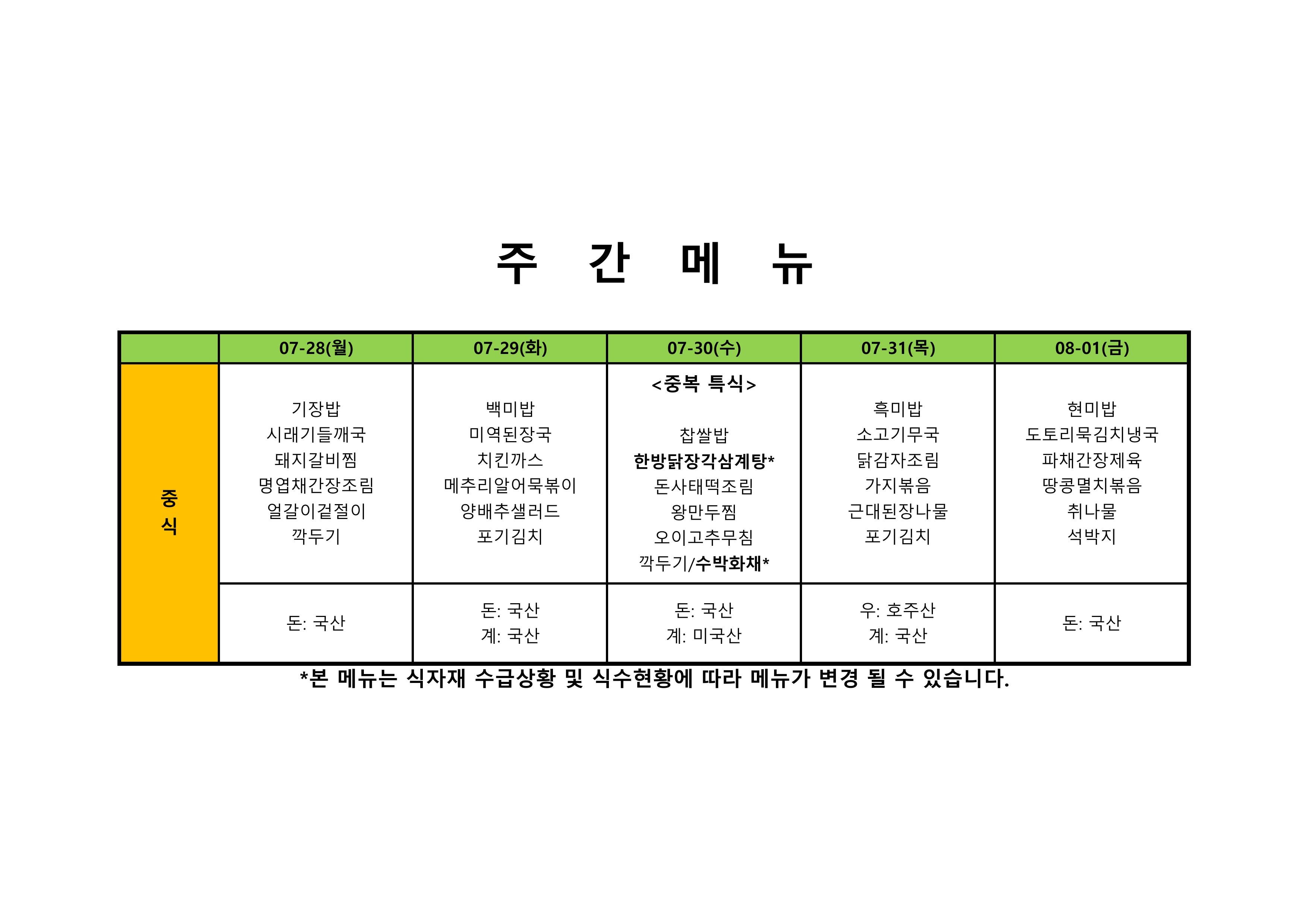 2024. 7. 22. ~ 2024. 7. 26. 주간식단표