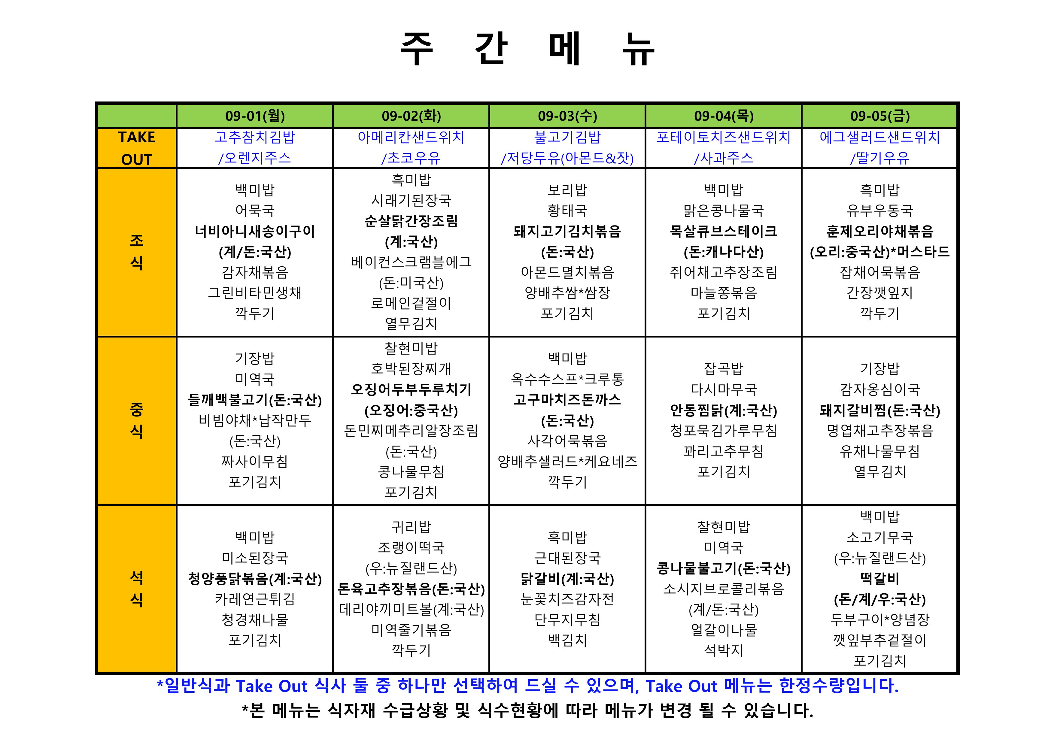 2026. 1. 5. ~ 2026. 1. 9. 주간식단표