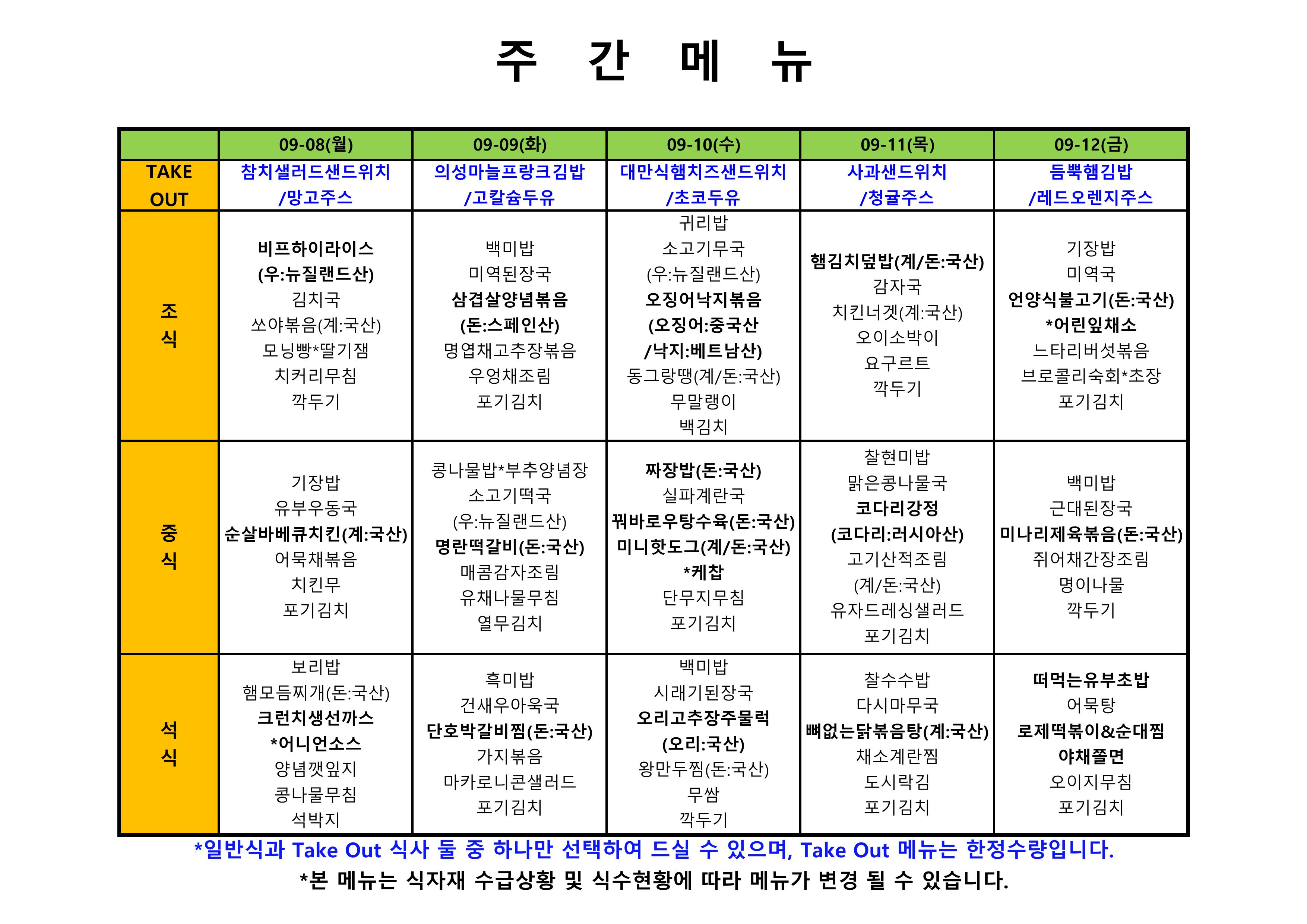 2026. 1. 5. ~ 2026. 1. 9. 주간식단표