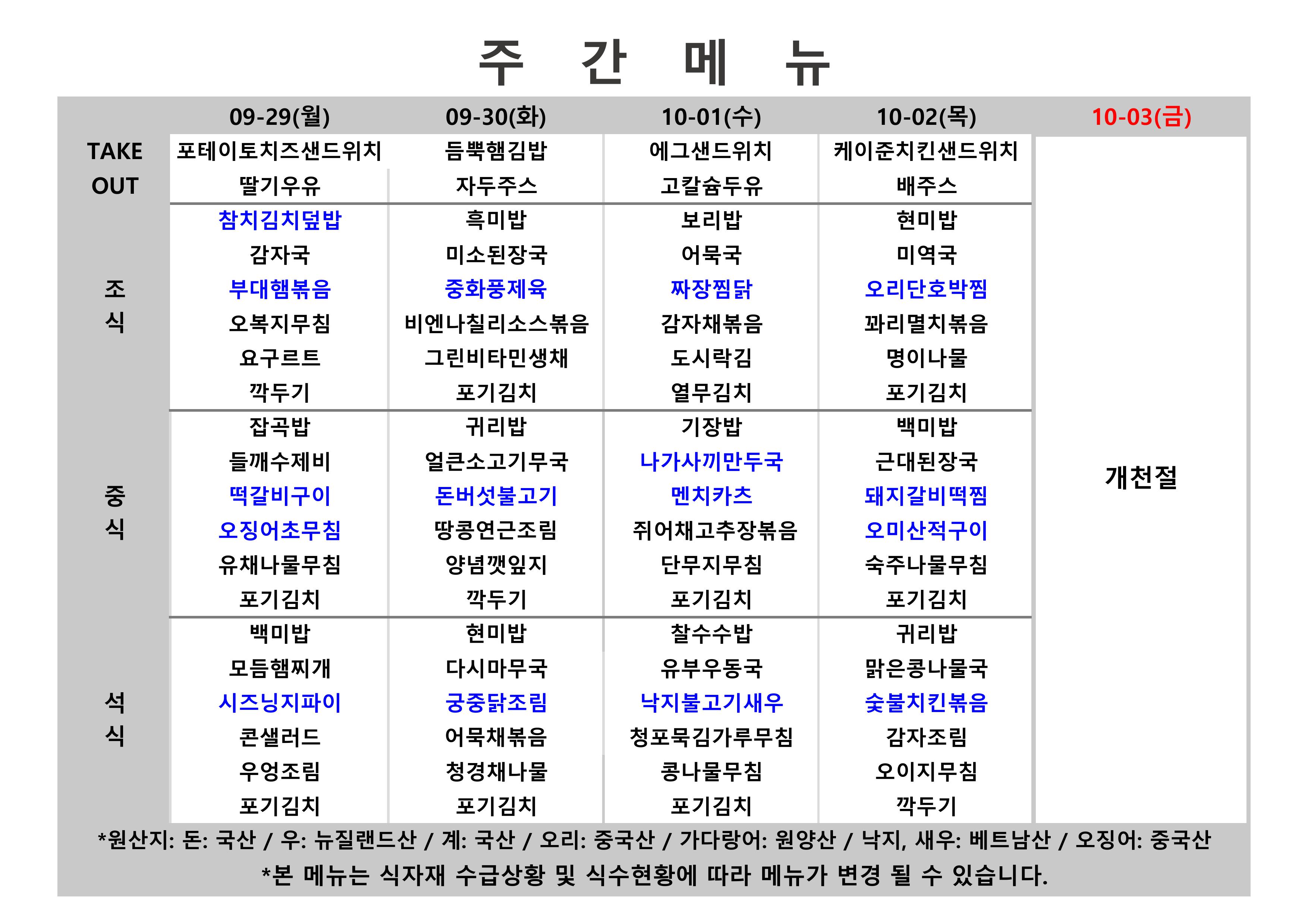 2025. 10. 06. ~ 2025. 10. 10. 주간식단표