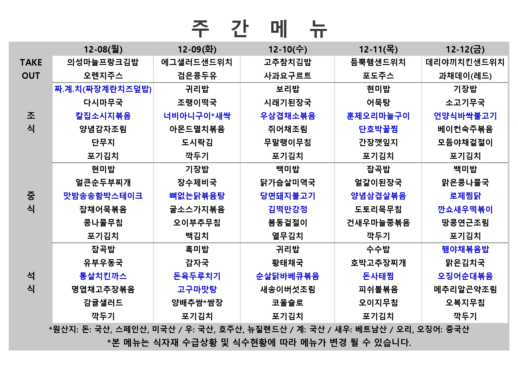 2025. 12. 8. ~ 2025. 12. 12. 주간식단표