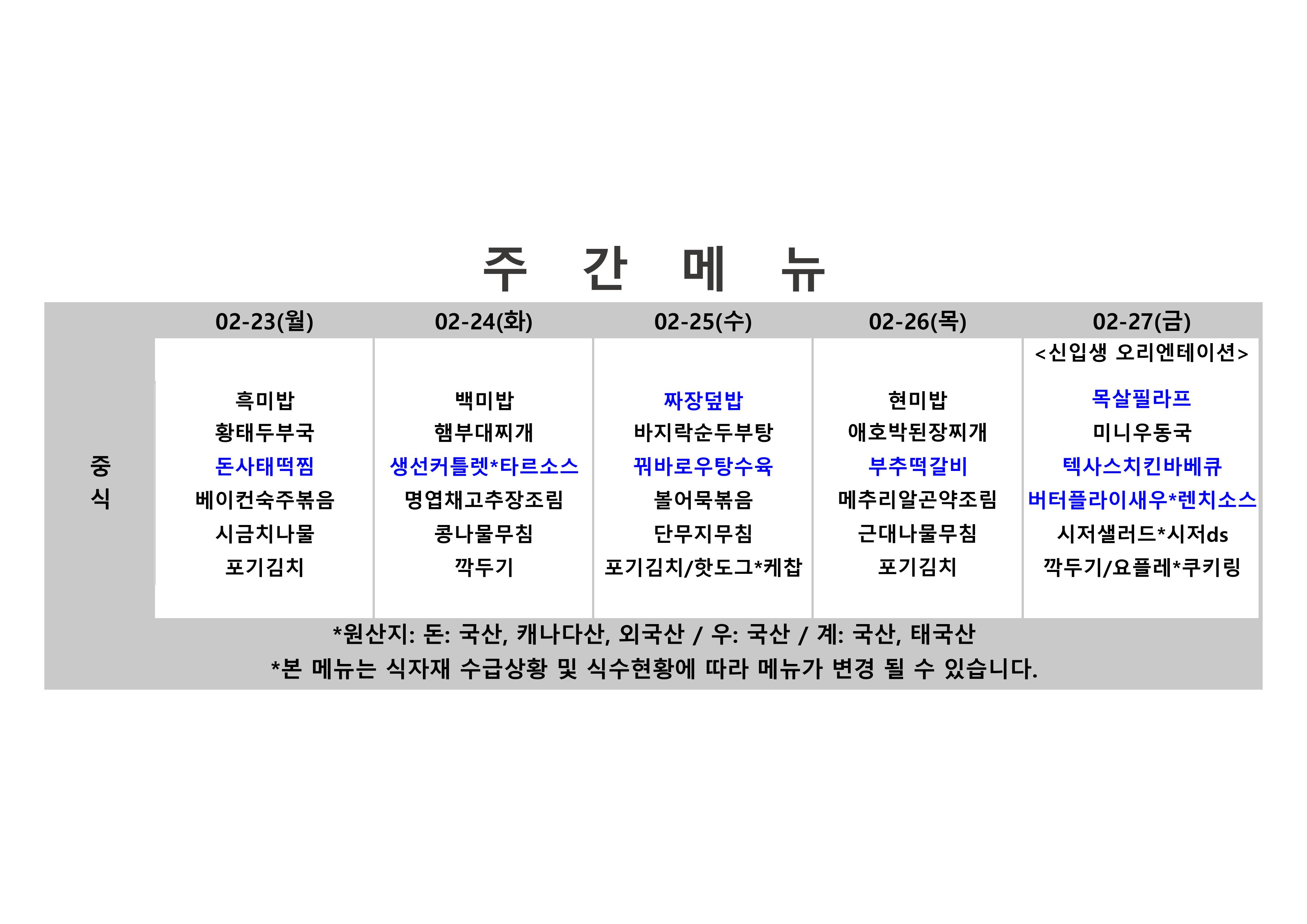 2026. 2. 23. ~ 2026. 2. 27. 주간식단표