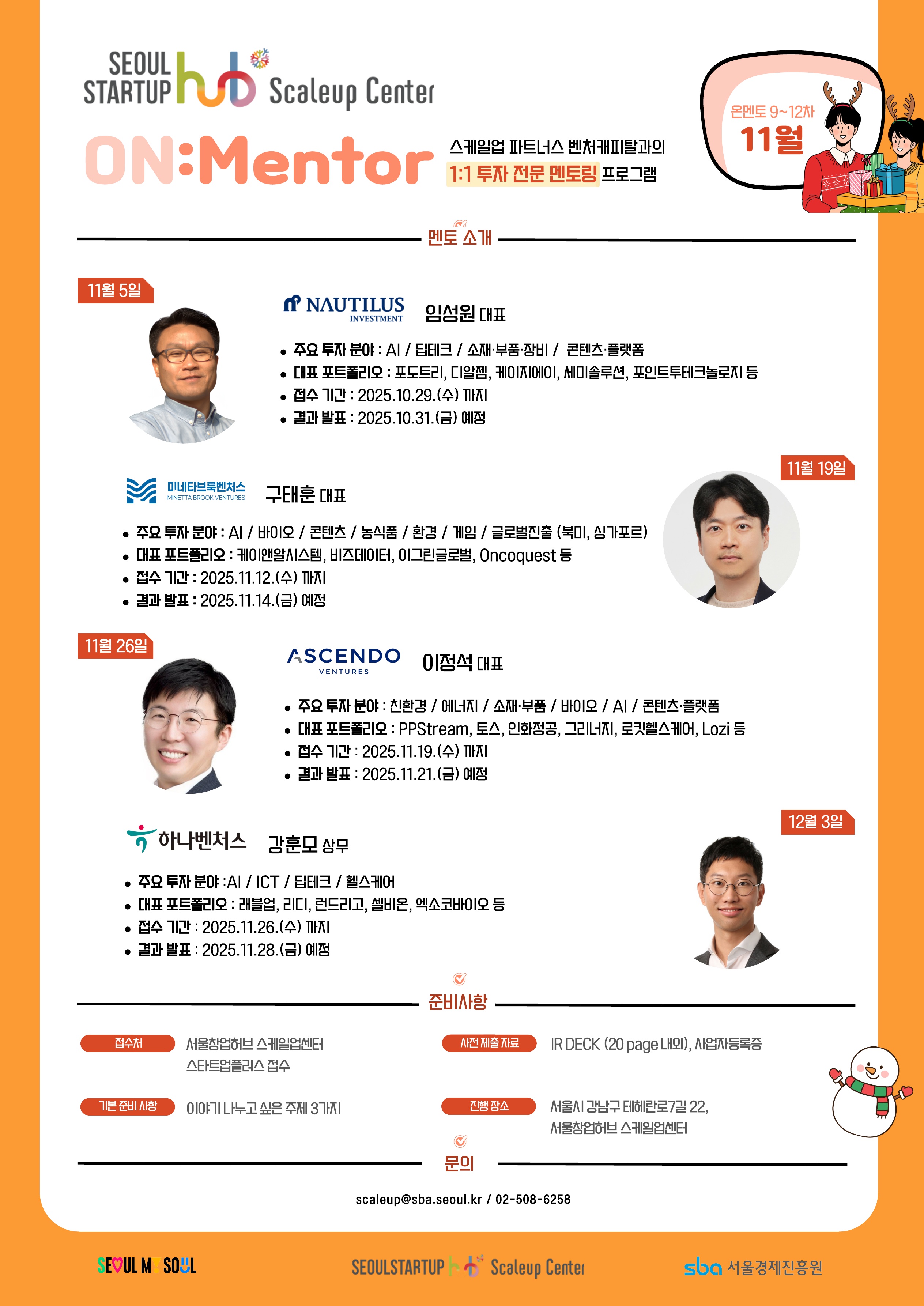 fnctId=bbs,fnctNo=597 페이지 공유 글번호 89917 [외부프로그램] [SBA] 서울창업허브 스케일업센터 ON:Mentor 프로그램 작성일 2025.11.04 수정일 2025.11.04 작성자 학생·취업과 조회수 49 첨부파일 첨부파일이(가) 없습니다.