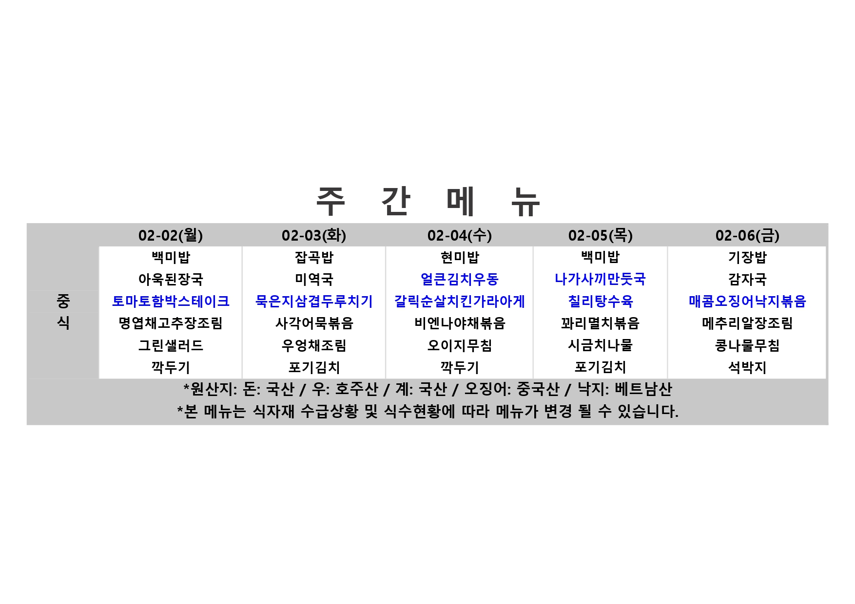 fnctId=bbs,fnctNo=484 단축 url 글번호 92418 2026. 2. 2. ~ 2026. 2. 6. 주간식단표 작성일 2026.01.29 수정일 2026.01.29 작성자 학생생활관(분원) 조회수 21300 다음글 2026. 2. 9. ~ 2026. 2. 13. 주간식단표 윤현지 2026-02-05 10:23:13.0 이전글 2026. 1. 26. ~ 2026. 1. 30. 주간식단표 윤현지 2026-01-22 09:56:55.0 RSS 2.0 총 100 개의 게시물이 있습니다. 게시물 검색 제목 작성자 게시글 리스트 학생생활관 이용 - 주간식단 번호 제목 작성자 작성일 조회수 100 2026. 3. 16. ~ 2026. 3. 20. 주간식단표 새글 학생생활관(분원) 2026.03.12 6984 99 <평택캠퍼스 재학생 대학식당 이용 안내> 학생생활관(분원) 2026.03.10 7223 98 2026. 3. 9. ~ 2026. 3. 13. 주간식단표 학생생활관(분원) 2026.03.06 5436 97 2026. 3. 3. ~ 2026. 3. 6. 주간식단표 학생생활관(분원) 2026.02.27 5264 96 2026. 2. 23. ~ 2026. 2. 27. 주간식단표 학생생활관(분원) 2026.02.19 4865 95 2026. 2. 16. ~ 2026. 2. 20. 주간식단표 학생생활관(분원) 2026.02.05 6774 94 2026. 2. 9. ~ 2026. 2. 13. 주간식단표 학생생활관(분원) 2026.02.05 14522 93 2026. 2. 2. ~ 2026. 2. 6. 주간식단표 학생생활관(분원) 2026.01.29 21300 92 2026. 1. 26. ~ 2026. 1. 30. 주간식단표 학생생활관(분원) 2026.01.22 24920 91 2026. 1. 19. ~ 2026. 1. 23. 주간식단표 학생생활관(분원) 2026.01.15 3830 90 2026. 1. 12. ~ 2026. 1. 16. 주간식단표 학생생활관(분원) 2026.01.08 22728 89 2026. 1. 5. ~ 2026. 1. 9. 주간식단표 학생생활관(분원) 2026.01.02 2117 88 2025. 12. 29. ~ 2026. 1. 2. 주간식단표 학생생활관(분원) 2025.12.24 19850 87 2025. 12. 22. ~ 2025. 12. 26. 주간식단표 학생생활관(분원) 2025.12.19 29268 86 2025. 12. 15. ~ 2025. 12. 19. 주간식단표 학생생활관(분원) 2025.12.11 43980 85 2025. 12. 8. ~ 2025. 12. 12. 주간식단표 학생생활관(분원) 2025.12.04 69571 84 2025. 12. 1. ~ 2025. 12. 5. 주간식단표 학생생활관(분원) 2025.11.27 75564 83 2025. 11. 24. ~ 2025. 11. 28. 주간식단표 학생생활관(분원) 2025.11.20 134605 82 2025. 11. 17. ~ 2025. 11. 21. 주간식단표 학생생활관(분원) 2025.11.13 139014 81 2025. 11. 10. ~ 2025. 11. 14. 주간식단표 학생생활관(분원) 2025.11.06 127482 80 2025. 11. 03. ~ 2025. 11. 07. 주간식단표 학생생활관(분원) 2025.10.30 119507 79 2025. 10. 27. ~ 2025. 10. 31. 주간식단표 학생생활관(분원) 2025.10.23 157503 78 2025. 10. 20. ~ 2025. 10. 24. 주간식단표 학생생활관(분원) 2025.10.17 119313 77 2025. 10. 13. ~ 2025. 10. 17. 주간식단표 학생생활관(분원) 2025.10.02 84603 76 2025. 10. 06. ~ 2025. 10. 10. 주간식단표 학생생활관(분원) 2025.10.02 85322 75 2025. 9. 29. ~ 2025. 10. 3. 주간식단표 학생생활관(분원) 2025.09.25 120209 74 2025. 9. 22. ~ 2025. 9. 26. 주간식단표 학생생활관(분원) 2025.09.19 99206 73 2025. 9. 15. ~ 2025. 9. 19. 주간식단표 학생생활관(분원) 2025.09.11 82409 72 2025. 9. 8. ~ 2025. 9. 12. 주간식단표 학생생활관(분원) 2025.09.06 73861 71 2025. 9. 1. ~ 2025. 9. 5. 주간식단표 학생생활관(분원) 2025.08.27 48410 70 2025. 8. 11. ~ 2025. 8. 14. 주간식단표 학생생활관(분원) 2025.08.07 37135 69 2025. 8. 4. ~ 2025. 8. 8. 주간식단표 학생생활관(분원) 2025.08.01 53573 68 2025. 7. 28. ~ 2025. 8. 1. 주간식단표 학생생활관(분원) 2025.07.25 51776 67 2025. 7. 21. ~ 2025. 7. 25. 주간식단표 학생생활관(분원) 2025.07.17 31816 66 2025. 7. 14. ~ 2025. 7. 18. 주간식단표 학생생활관(분원) 2025.07.11 30885 65 2025. 7. 7. ~ 2025. 7. 11. 주간식단표 학생생활관(분원) 2025.07.04 24761 64 2025. 6. 30. ~ 2025. 7. 4. 주간식단표 학생생활관(분원) 2025.06.27 42592 63 2025. 6. 23. ~ 2025. 6. 27. 주간식단표 학생생활관(분원) 2025.06.20 27518 62 2025. 6. 16. ~ 2025. 6. 20. 주간식단표 학생생활관(분원) 2025.06.13 48760 61 2025. 6. 9. ~ 2025. 6. 13. 주간식단표 학생생활관(분원) 2025.06.05 35742 60 2025. 6. 2. ~ 2025. 6. 6. 주간식단표 학생생활관(분원) 2025.05.30 57304 59 2025. 5. 26. ~ 2025. 5. 30. 주간식단표 학생생활관(분원) 2025.05.23 61844 58 2025. 5. 19. ~ 2025. 5. 23. 주간식단표 학생생활관(분원) 2025.05.16 53261 57 2025. 5. 12. ~ 2025. 5. 16. 주간식단표 학생생활관(분원) 2025.05.09 48885 56 2025. 5. 5. ~ 2025. 5. 9. 주간식단표 학생생활관(분원) 2025.05.02 65502 55 2025. 4. 28. ~ 2025. 5. 2. 주간식단표 학생생활관(분원) 2025.04.25 61743 54 2025. 4. 21. ~ 2025. 4. 25. 주간식단표 학생생활관(분원) 2025.04.18 48554 53 2025. 4. 14. ~ 2025. 4. 18. 주간식단표 학생생활관(분원) 2025.04.15 39739 52 2025. 4. 7. ~ 2025. 4. 11. 주간식단표 학생생활관(분원) 2025.04.07 51611 51 2025. 3 .31. ~ 2025. 4. 4. 주간식단표 학생생활관(분원) 2025.03.31 52926 50 2025. 3. 24. ~ 2025. 3. 28. 주간식단표 학생생활관(분원) 2025.03.24 52734 49 2025. 3. 10. ~ 2025. 3. 14. 주간식단표 학생생활관(분원) 2025.03.10 38357 48 2025. 2. 10.~2025. 2. 14. 주간식단표 학생생활관(분원) 2025.02.10 33517 47 2025. 2 . 3.~2025. 2. 7. 주간식단표 학생생활관(분원) 2025.02.03 34477 46 2025. 1. 20. ~ 2025. 1. 24. 주간식단표 학생생활관(분원) 2025.01.20 33021 45 2025. 1. 13. ~ 2025. 1. 17. 주간식단표 학생생활관(분원) 2025.01.10 43389 44 2025. 1. 6. ~ 2025. 1. 10. 주간식단표 학생생활관(분원) 2025.01.06 57473 43 2024. 12. 30. ~ 2025. 1. 3. 주간식단표 학생생활관(분원) 2024.12.31 60394 42 2024. 12. 16.~2024. 12. 20. 주간식단표 학생생활관(분원) 2024.12.16 54465 41 2024. 12. 2.~ 2024. 12. 6. 주간식단표 학생생활관(분원) 2024.12.02 52680 40 2024. 11. 18.~2024. 11. 22. 주간식단표 학생생활관(분원) 2024.11.18 49250 39 2024. 11. 11.~2024. 11. 15. 주간식단표 학생생활관(분원) 2024.11.11 42